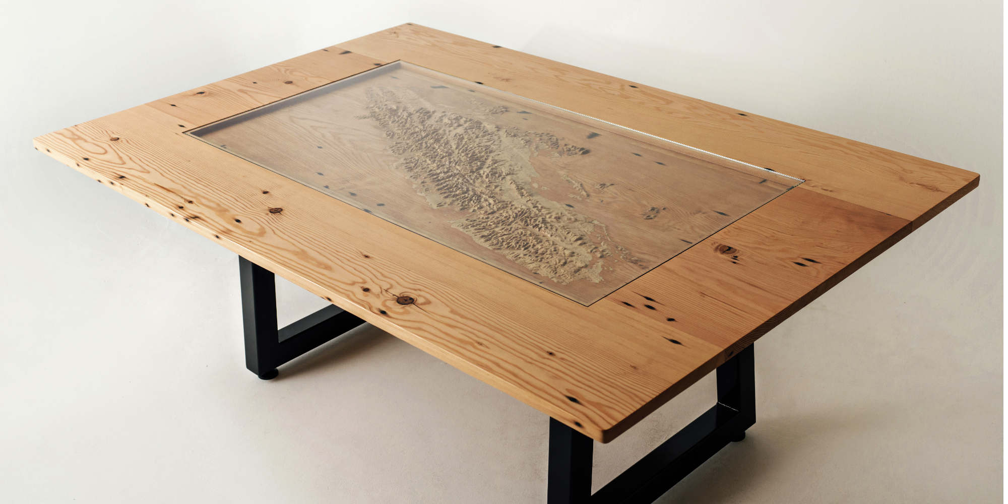 For this glass top table, a 3D topographical map of Vancouver Island and surrounding islands was carved in maple and inlaid into a sea of reclaimed old-growth Douglas fir. It was built for Ryzuk Geotechnical, whose founders wanted something special to feature in their boardroom.